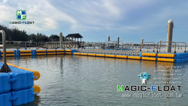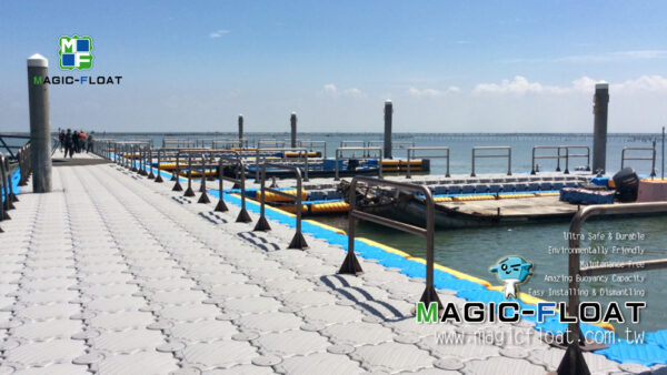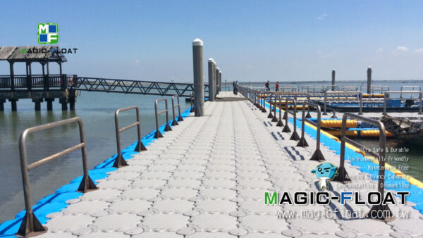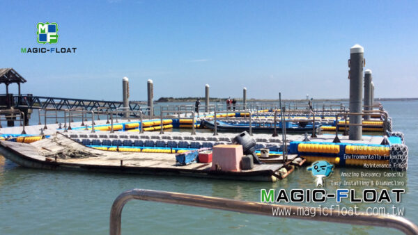This floating pontoon is for <Taijiang National Park Nanwan Recreation Area Eco-tourism Service Facilities Improvement Project> government project. The project proposes a new floating pier for sightseeing fishing rafts to replace old one at Wangzailiao Wharf in Qigu District, including ship mooring facilities and pier ancillary facilities. The existing aluminum alloy approach bridge is used to connect the pier and the shore, existing PC piles are used to fix the new floating dock. The floating pier is made of Magic-Float II gray floats as the main body, with bright light blue floats around the pontoon frame, and Magic-Float VII low profile floats as stairs for tourists easily walking. There are also safety railings and handrails on the pier, and boat berthing facilities are Belaying Pins and yellow color 3L HDPE Fender are anti-collision materials installed around the floating platform to prevent ships from directly colliding with the floating structure.