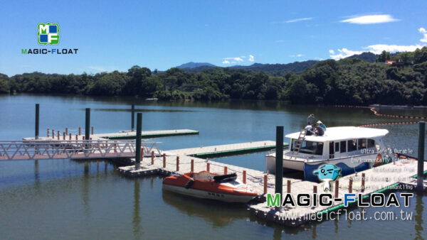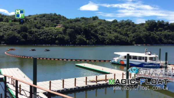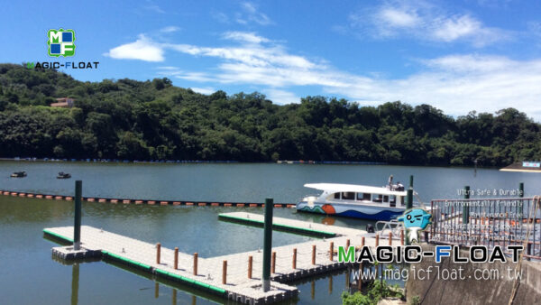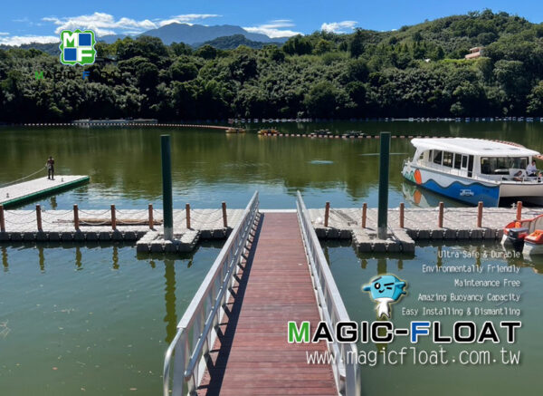 This project is part of the Miaoli County Government’s Culture and Tourism Bureau’s public works project, the Miaoli Minghu Waterfront Corridor Experience Enhancement Project (Phase II) – Mingde Reservoir Service Area Pier Construction Project. The floating pier is located in the Mingde Reservoir service area, connected with land by a 20m long Aluminum Gangway, fixed by piles. The floating pier made by Magic-Float II grey cubes with light brown Balusters, green PE Fender, Belaying Pin, 1010 Roller System etc, allows visitors to easily and conveniently cruise around the lake on solar-powered yachts, enjoying the stunning scenery of the surrounding green mountains intertwined with the clear waters, as well as Rixin Island, Haitang Island, and Yuanyang Island within the lake. Touwu Township, Miaoli County, Mingde Reservoir, 20250821